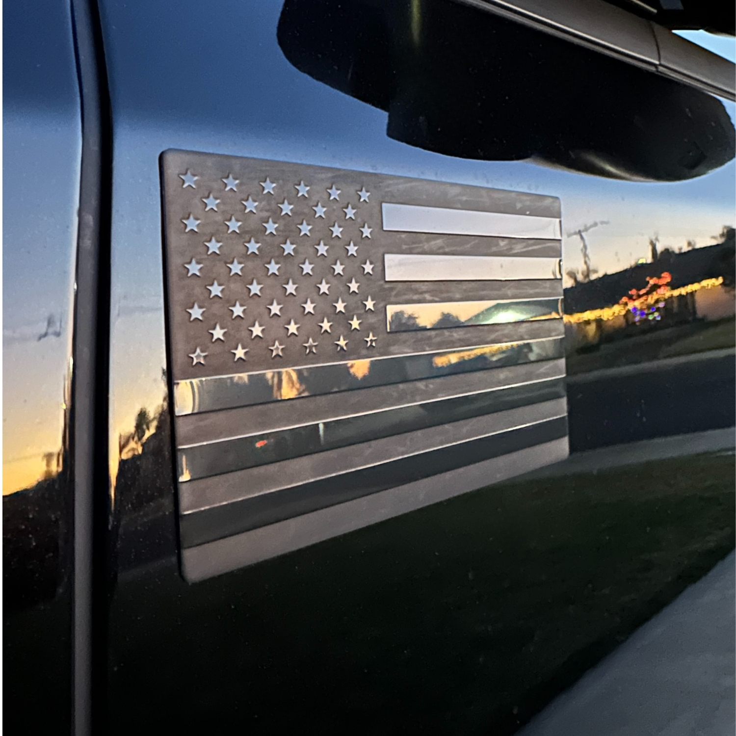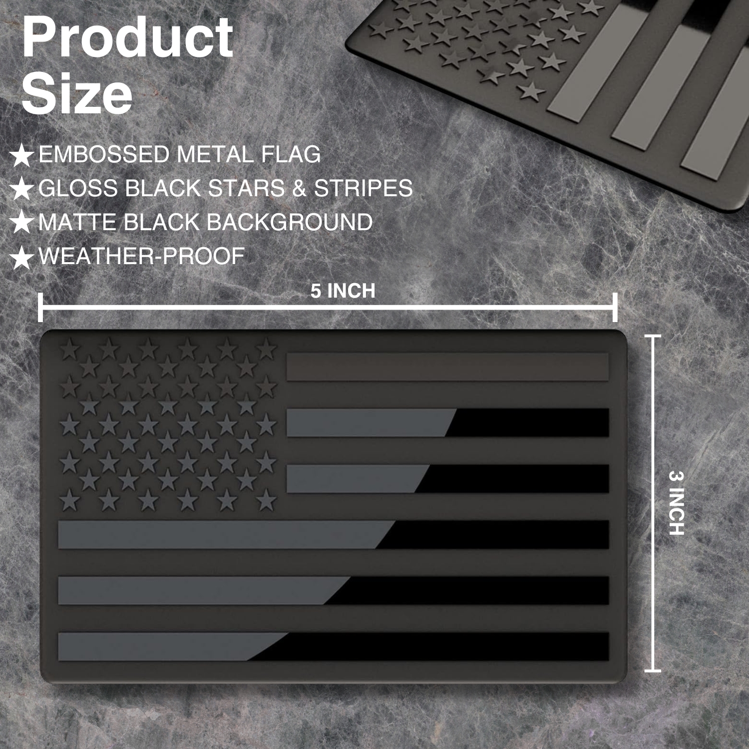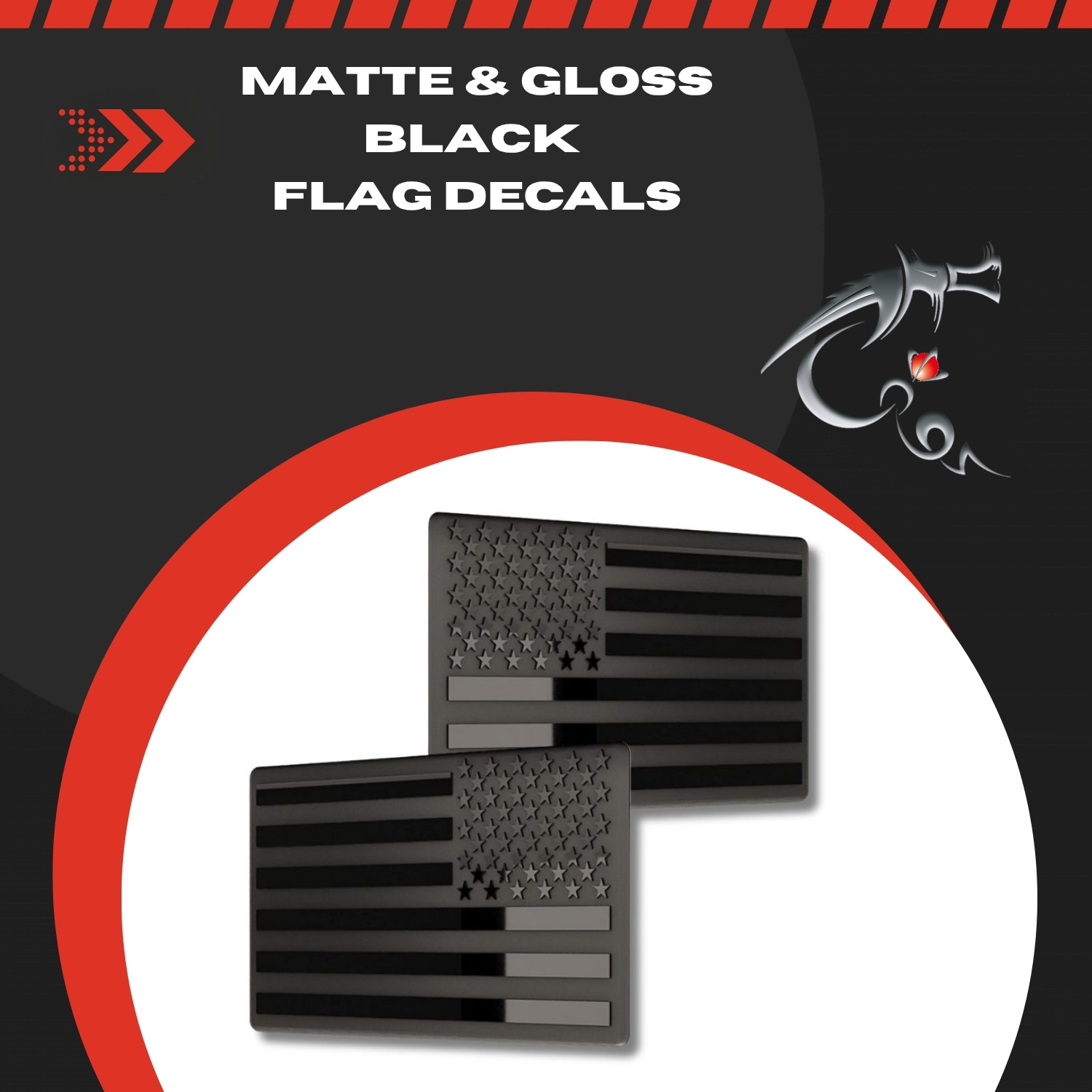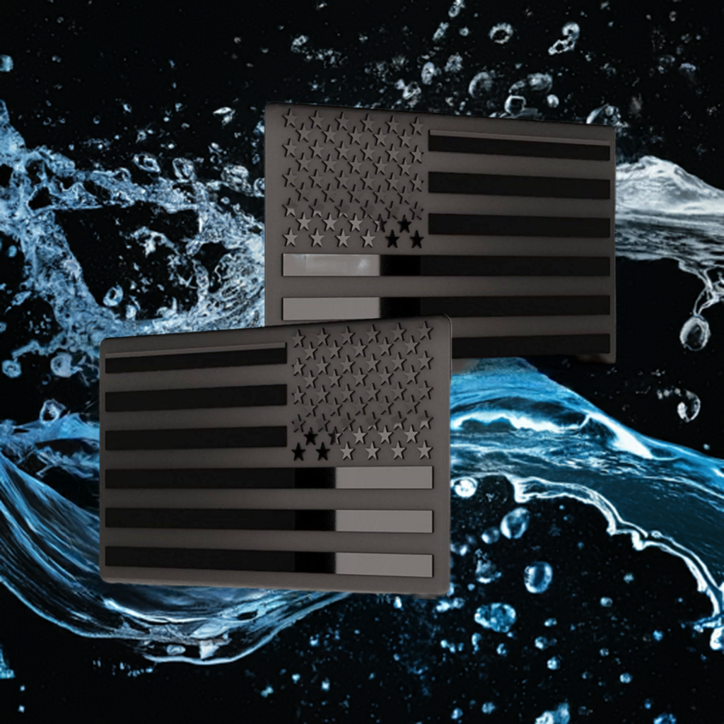 DragonWorks Performance is proud to introduce our line of Black American Flags! Our flags are made of die cut stainless steel and imprinted with both a gloss and matte black finish that is resistant to UV sunlight, rain, chemicals such as oils and fuels, and is carwash resistant against soap chemicals as well as carwash machines with high flow dryers.